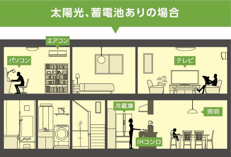 日中は太陽光発電の電気を使用しながら蓄電池に電気をためます。夜は日中にためた電気をつかうことができるから、停電していても1日中電気をつかうことができ、「いつもの生活」をなるべく維持することができます。