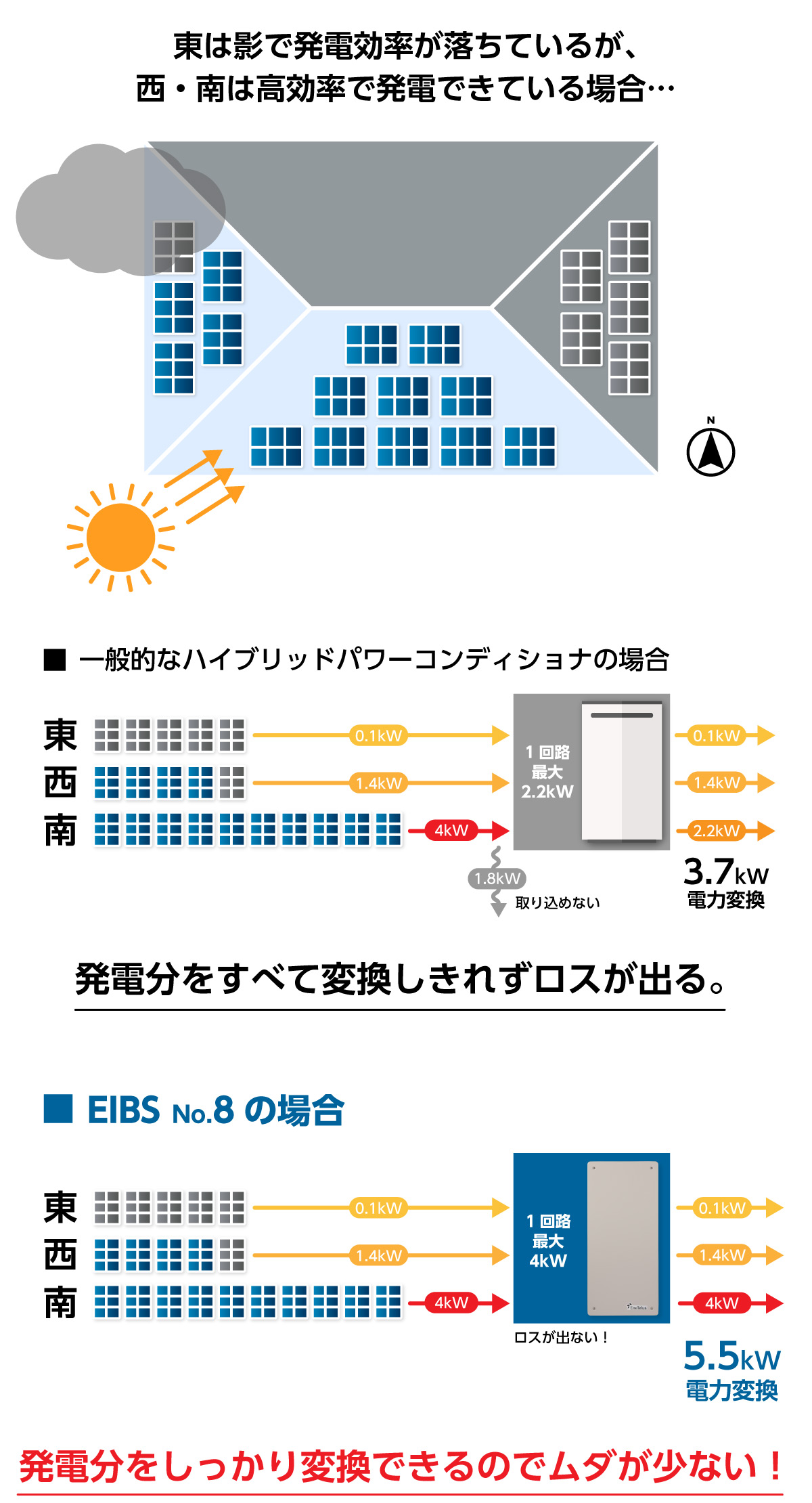 発電しながら充電したり、部分影などで発電が落ちても、他のストリングの発電でカバーすることができ、太陽電池の発電をさらにムダにすることなく、利用できます。