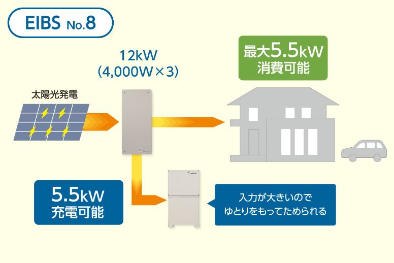 ハイブリッド蓄電システム EIBS No.8は、そのような非常時こそ役立つ安心の備えとして、性能を高め、さまざまな機能を搭載しています。