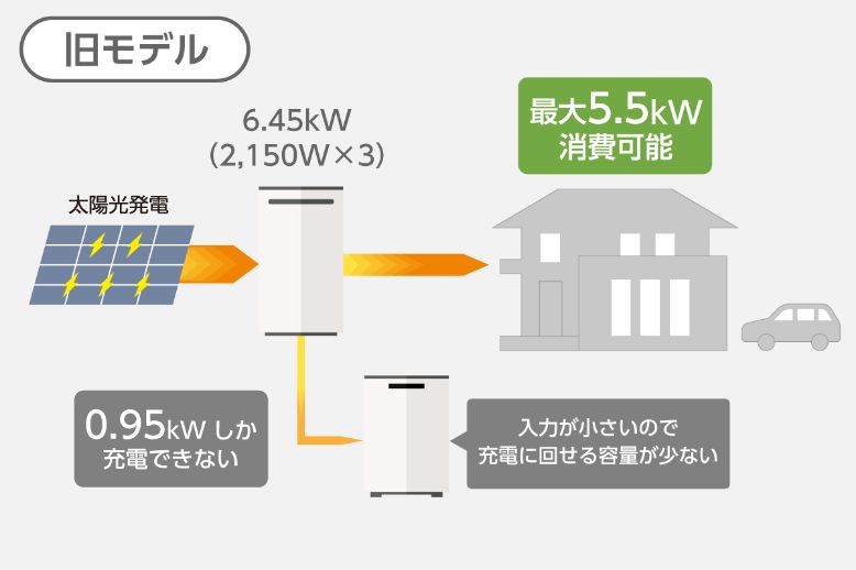 旧モデルでは最大出力に合わせた入力設計のため、消費が大きい時は充電に電力を回せませんでした。しかしEIBS No.8では“つかいながら充電”の機能を大幅改善し、最大出力でつかいながら同時に充電もできるようになりました。