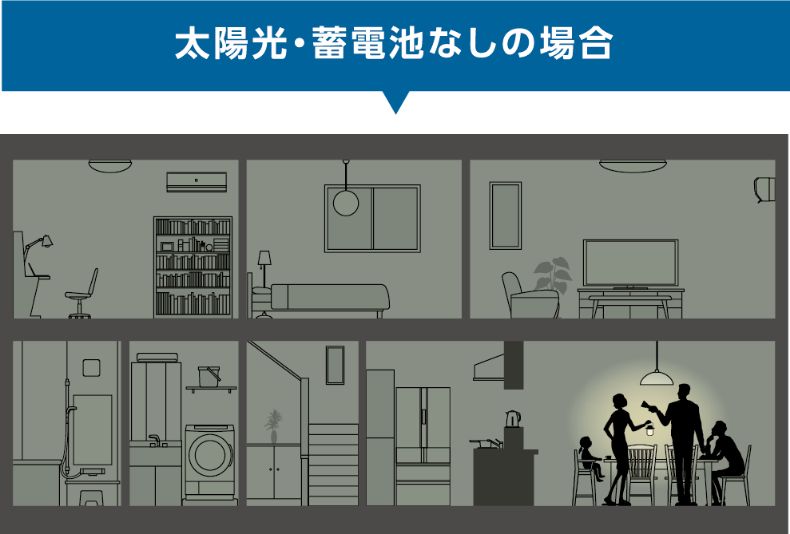 日中は太陽光発電の電気を使用しながら蓄電池に電気をためます。夜は日中にためた電気をつかうことができるから、停電していても1日中電気をつかうことができ、「いつもの生活」をなるべく維持することができます。