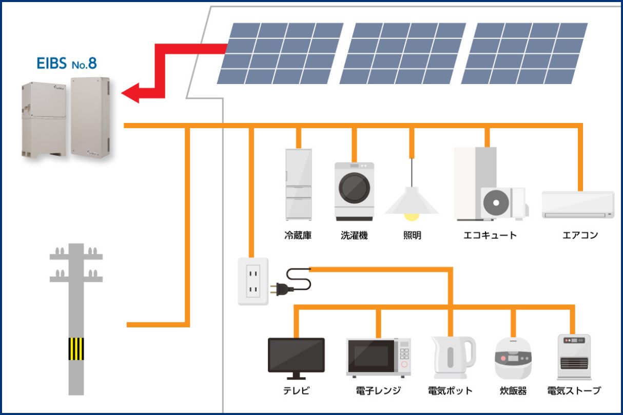 EIBS No.8なら、自動で自立運転に切り替え。太陽光発電のある日中は電気をつかいながら余った電力を蓄電池にためることができるので、停電が長引いてもゆとりを持って電気がつかえます。